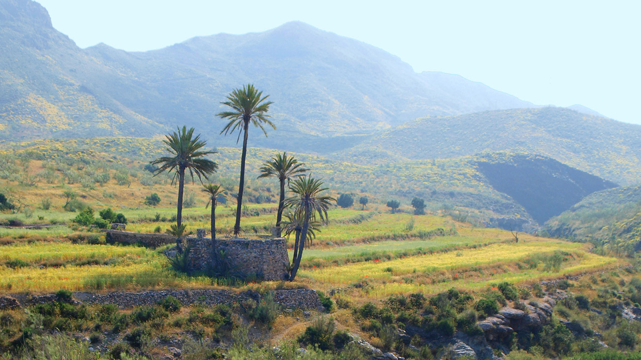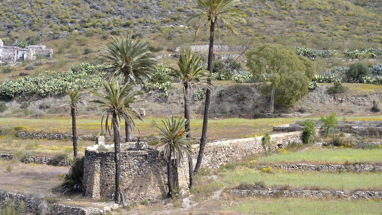 Junto a una montaña con aterrazamientos, palmeras y chumberas.